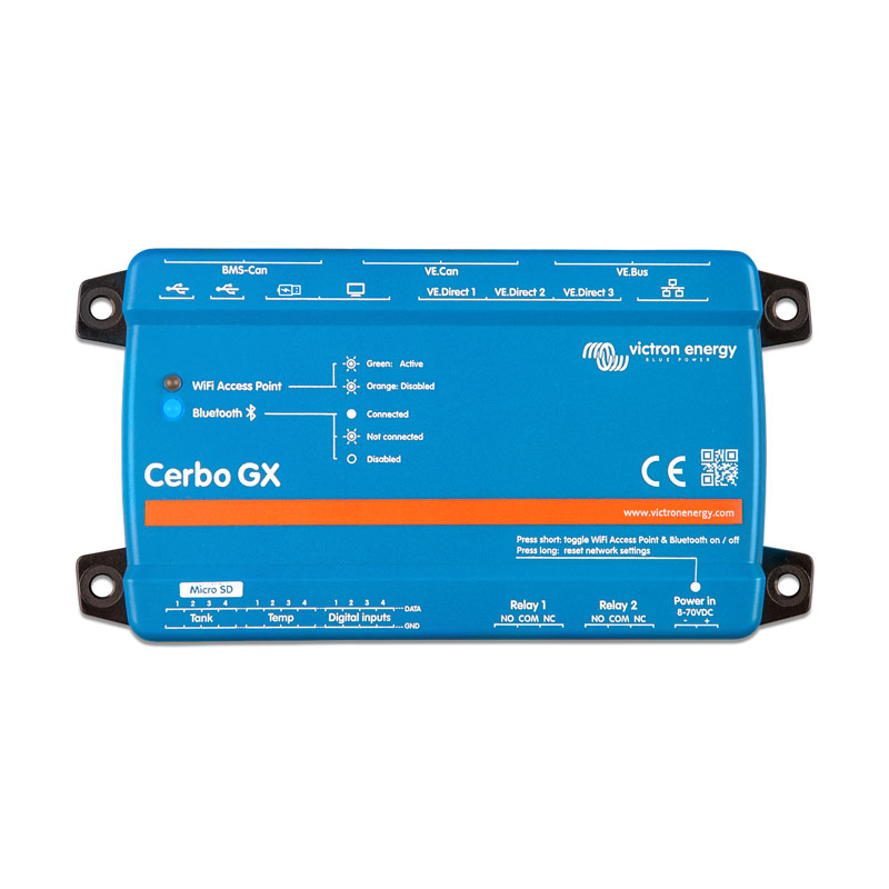 Le Cerbo GX maximise le rendement des éléments de votre système en temps réel et il les maintient en parfait harmonie. Grâce à son processeur Dual Core et à l’ajout d’un port Bus-CAN supplémentaire, vous pouvez à présent gérer des systèmes de plus grande taille ; suivre de près les batteries (lithium) qui sont gérées dans le système, pendant que le second port peut prendre en charge simultanément jusqu’à 25 chargeurs solaires VE.Can connectés. Grâce au nouveau support du protocole NMEA 2000, le GX peut facilement être intégré à n’importe quel réseau des bateaux. Grâce aux quatre réservoirs et aux quatre autres pour la température, ainsi qu’aux 3 ports VE.Direct, aux 3 ports USB, aux 4 entrées numériques et aux 2 relais, vous pouvez étendre à un niveau supérieur le contrôle de votre système. Il n’a jamais été aussi facile de maximiser le rendement de vos systèmes.